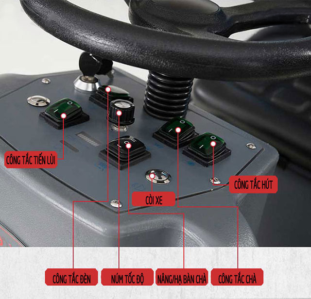 Đèn LED phía trước giúp máy vận hành ổn định trong điều kiện thiếu sáng. Ba bánh xe giúp máy di chuyển linh hoạt, tiếp cận mọi khu vực nhanh chóng.