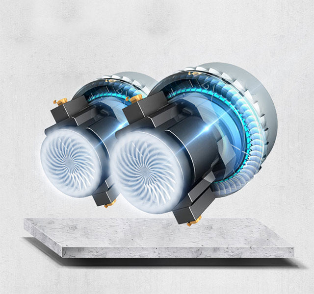 - Động cơ kép mạnh mẽ: Hai động cơ hoạt động đồng thời, tổng công suất 2400W, tạo lực hút chân không 250 mbar và lưu lượng khí 156 L/s. Mỗi động cơ có công tắc riêng, giúp linh hoạt sử dụng và tiết kiệm điện.