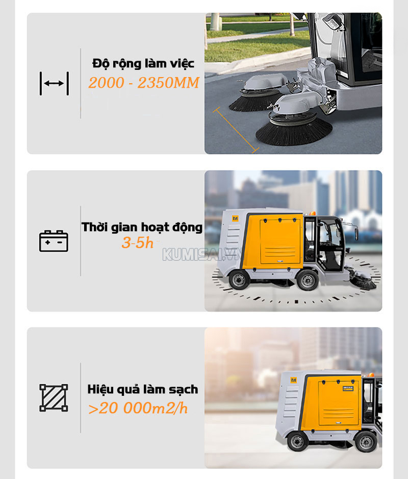- Thay thế lao động thủ công: Với hiệu suất 15.000 $m^2/h$, một chiếc xe có thể thay thế sức lao động của 20 - 30 công nhân vệ sinh. Doanh nghiệp có thể tiết kiệm hàng trăm triệu đồng chi phí nhân công mỗi năm.