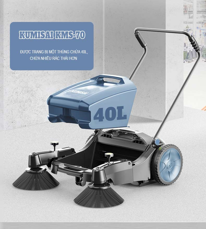 Với độ rộng quét gần 1 mét, KMS-70 cho phép người dùng bao phủ diện tích lớn chỉ trong một lượt đẩy, thay thế hiệu quả cho 4-6 lao động thủ công dùng chổi truyền thống.