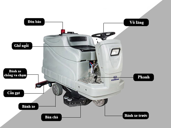 Kumisai KMS 2007 được trang bị ghế ngồi lái, tay lái và hệ thống điều khiển tiện lợi, cho phép người dùng dễ dàng vận hành máy. Hệ thống bánh xe linh hoạt giúp máy di chuyển nhanh chóng và hiệu quả trên mọi loại sàn.