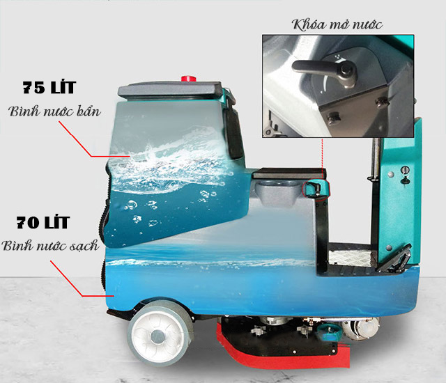 - 2 bình chứa "siêu to": 70L nước sạch + 75L nước bẩn, hạn chế tối đa việc đổ thay nước giữa ca.