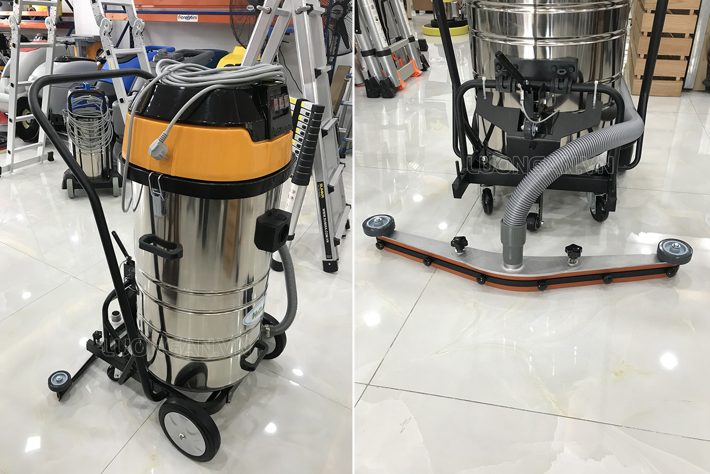 Phụ tùng: 1 bàn hút nước/bụi, 02 ống Inox, 1 ống hút, 1 đầu hút góc, 1 đầu chổi tròn