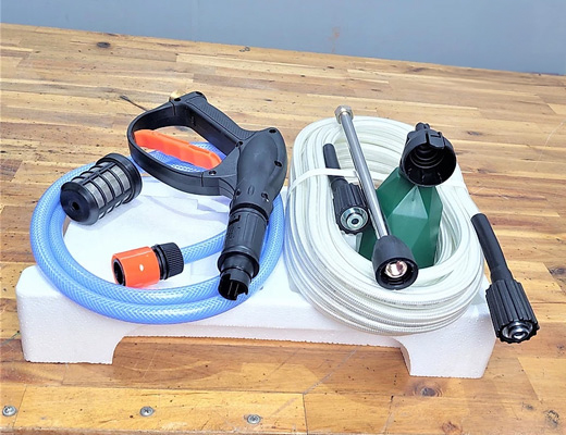 - Bộ phụ kiện chuyên nghiệp: Đi kèm dây áp lực dài (10-15m) , đầu lọc, nối vòi nước, súng phun cò nhạy và bình xà phòng mini, giúp việc xịt rửa tại nhà chuyên nghiệp như ở tiệm.