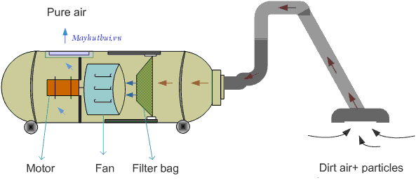 Trong khoang máy, bụi bẩn sẽ được tách ra khỏi không khí và giữ lại trong thùng chứa, trong khi không khí sẽ được lọc sạch qua bộ phận lọc và thải ra môi trường. Quá trình này xảy ra liên tục để đảm bảo vệ sinh sạch sẽ cho khu vực làm việc.